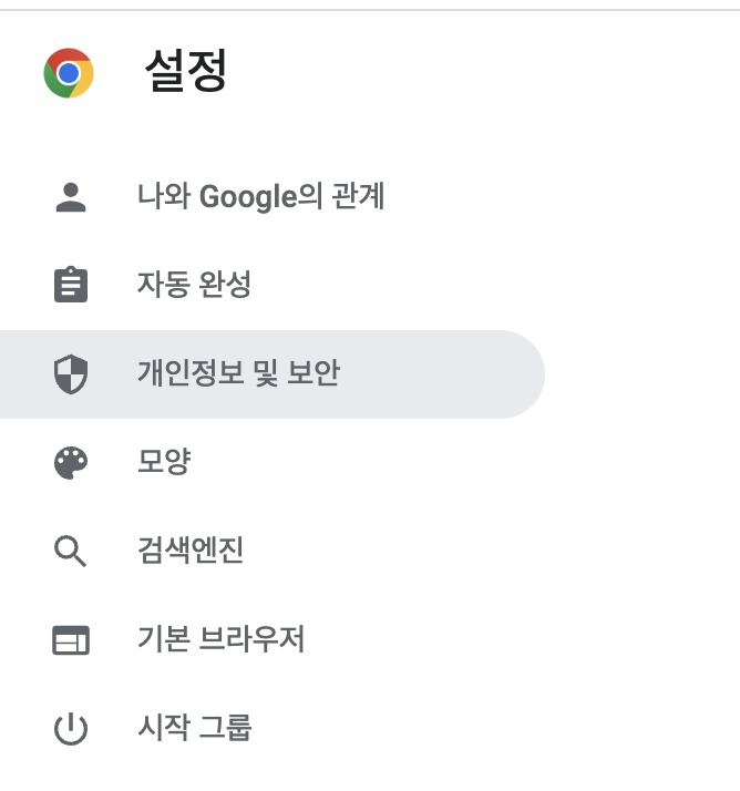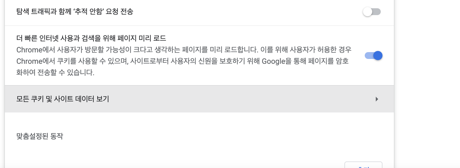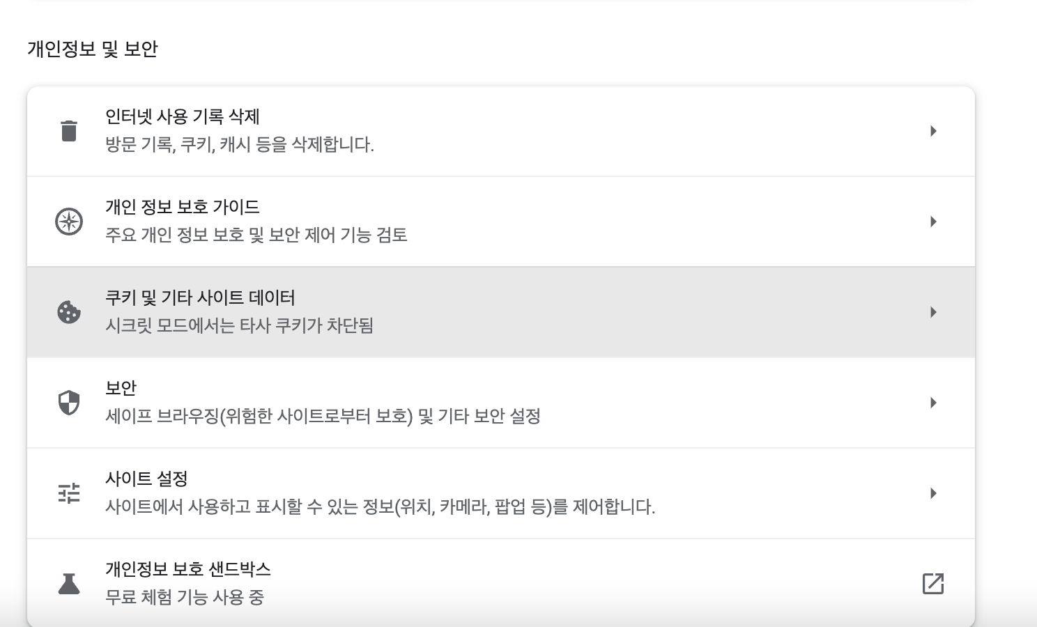 개인정보 및 보안 -> 쿠키 및 기타 사이트 데이터 클릭