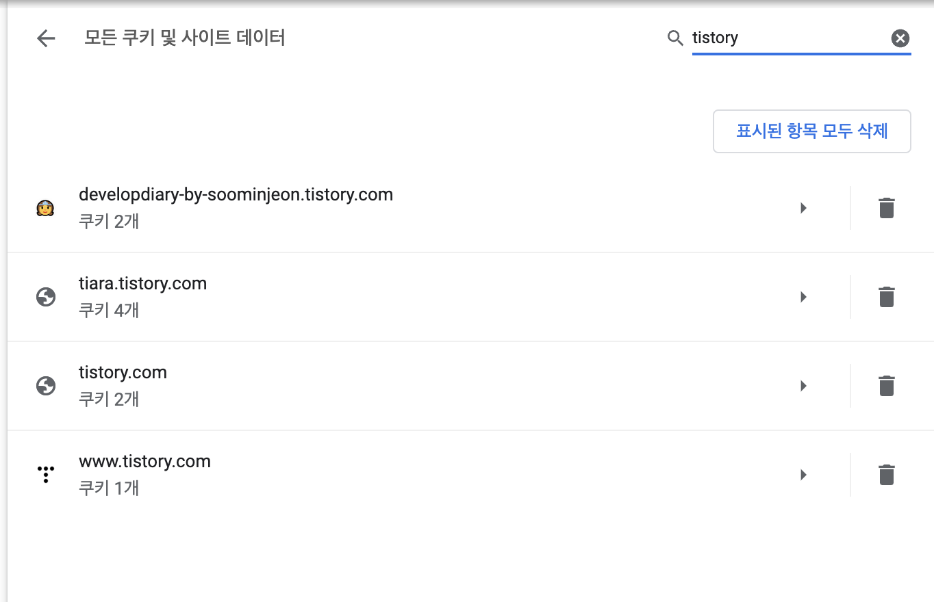 5. 쿠키 삭제할 사이트 명 검색 후 삭제
