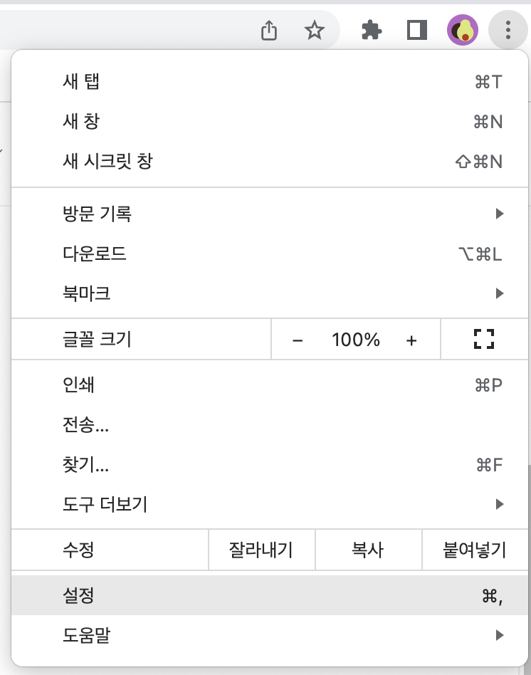 1. 크롬 오른쪽 상단 점 세개 -> 설정 누르기